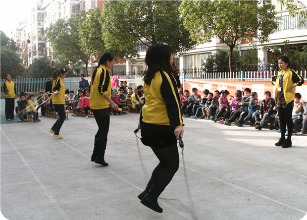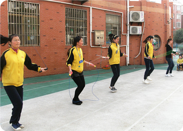 下午进行的是“教师跳绳比赛”,老师们个个精神饱满、摩拳擦掌。随着裁判员的一声令下,比赛正式开始!“唰唰唰” 绳子在老师们的手中舞动,形成优美的弧线,不断击打着地面。每组比赛时长一分钟。各组教师分秒必争,现场气氛热烈,竞争也异常激烈,跳绳速度被不停地刷新。最终,徐红、周静、祁慧三位老师夺得了此次跳绳比赛的前三名,赢得了老师和小朋友们的阵阵欢呼与喝彩。