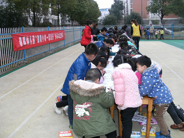 为了将 “热爱自然,保护环境”这一理念广泛传播,幼儿园把画布悬在园外栏杆上,让大家都能看到孩子们的作品,感受到他们爱护自然、保护环境的美好心愿。(李芳)