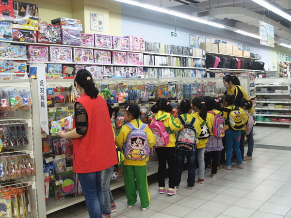 在老师的带领下,孩子们乘校车来到人民路大型超市乐天玛特。虽然孩子们不是第一次逛超市,但与老师和小朋友一起逛还是第一次。超市工作人员热情地迎接了春晖小朋友们。