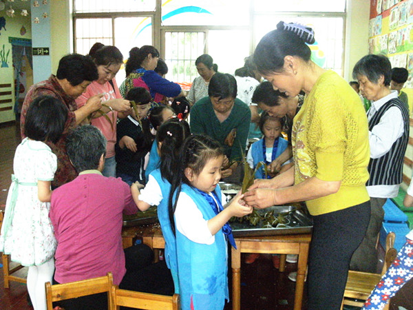 小朋友们和家长一起动手包粽子,包出来的粽子形态各异,幼儿园内充满了欢快的笑声。在浓浓的节日气氛里,孩子与家长一起包粽子,既锻炼和发展了幼儿的动手能力,也增进了幼儿对中国传统文化的了解。(李芳)