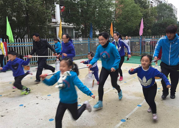 随着小运动员们的入场,此次亲子运动会拉开了序幕。紧接着,教师健美操和幼儿器械操依次登场。老师们充满活力的舞姿,孩子们活泼可爱的动作,赢得了家长们的阵阵掌声。在游戏环节,小班亲子赛《跳圈圈》、《看谁得第一》,中班亲子赛《抢板凳》、《两人三足》,大班亲子赛《兜兜乒乓球》、《抬轿子》等各展风采,在热烈、有趣的游戏中,家长和幼儿们增进了亲子感情,体会了运动的快乐,也为孩子们美丽的童年添上了精彩的一笔。(李芳)