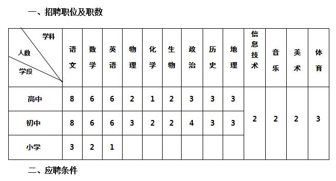 3.高中:应届毕业生、硕士研究生:第一学历为本科第一批次(免费师范生、担任过主要学生干部的毕业生优先考虑);在职教师:第一学历本科及以上,有三年以上教学经验,年龄40岁以下。特别优秀的(即具有教学实绩的毕业班教师,省市及以上教学大赛获奖者及优秀德育工作者,有实绩的学科竞赛教练员,班主任工作业绩突出等条件之一者)可适当放宽条件。