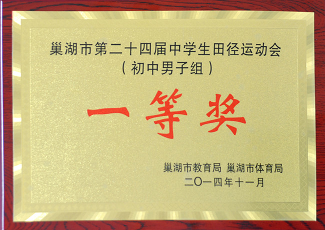 2014年11月,我校运动员获得巢湖市第二十四届中学生田径运动会初中男子组一等奖。