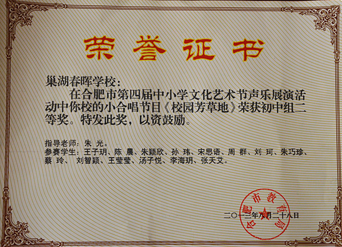 近日获悉,在今年六月份举行的合肥市第四届中小学文化艺术节声乐展演活动中,我校合唱团在校团委书记朱光老师的指导下,以一曲《校园芳草地》参演,并荣获初中组二等奖。在此特向他们表示热烈的祝贺。