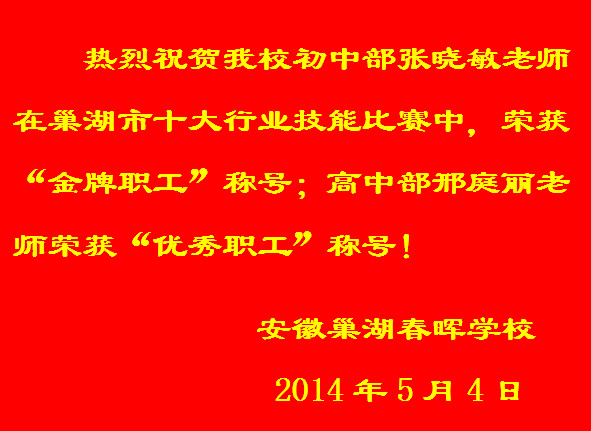 热烈祝贺我校教师张晓敏荣获巢湖市“金牌职工”称号!