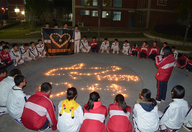同学们围成一个圆圈,点燃摆放成心形和飞机形状的蜡烛。在烛火摇曳中,任乐同学为大家介绍了失联航班的大致情况。同学们双手合十,表达对失联航班MH370最衷心的祝福,并依次说出自己的心愿:祝愿“马航”平安归来,希望身边的亲朋平安快乐。