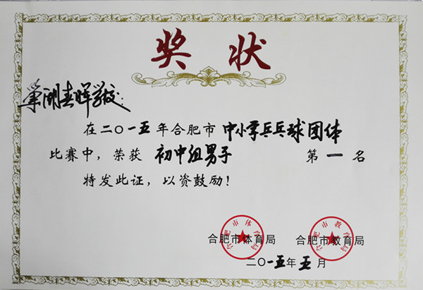 合肥市中小学乒乓球比赛中荣获初中男子团体第一名!
