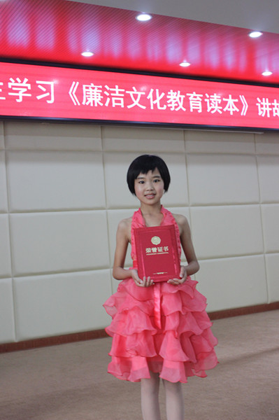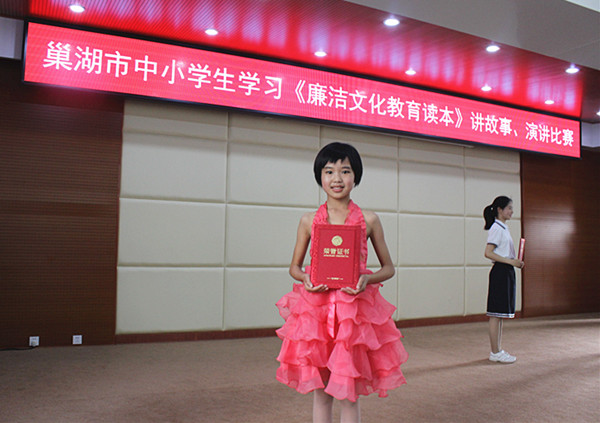 热烈祝贺我校713班徐欣雨同学在巢湖市教育局举办的中小学生《廉洁文化教育读本》系列活动之演讲比赛中荣获一等奖第一名!