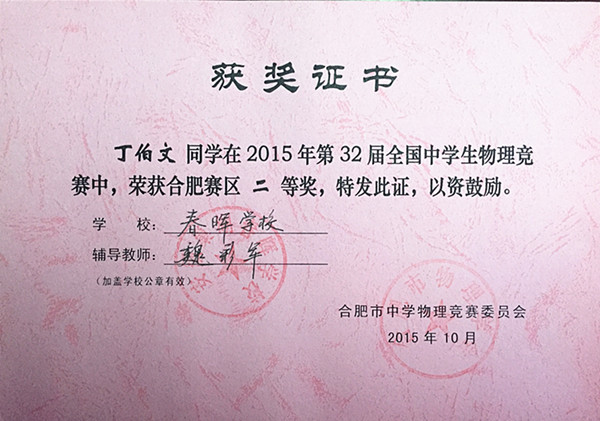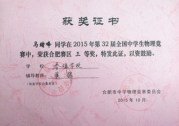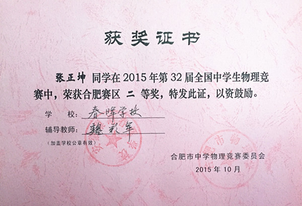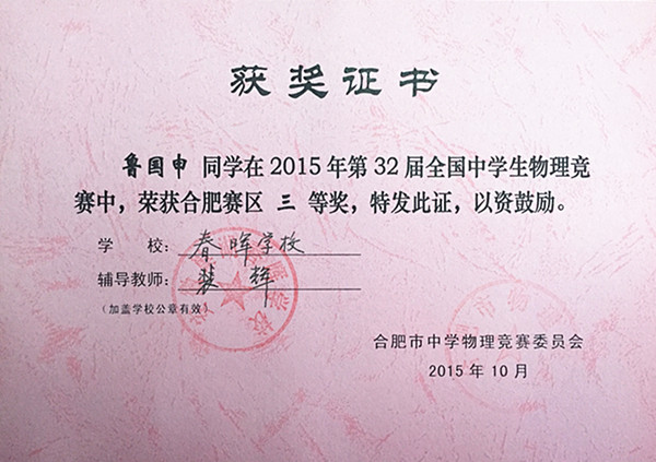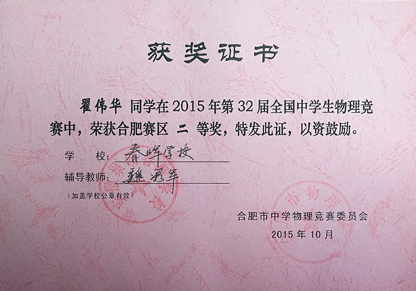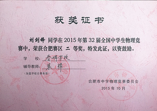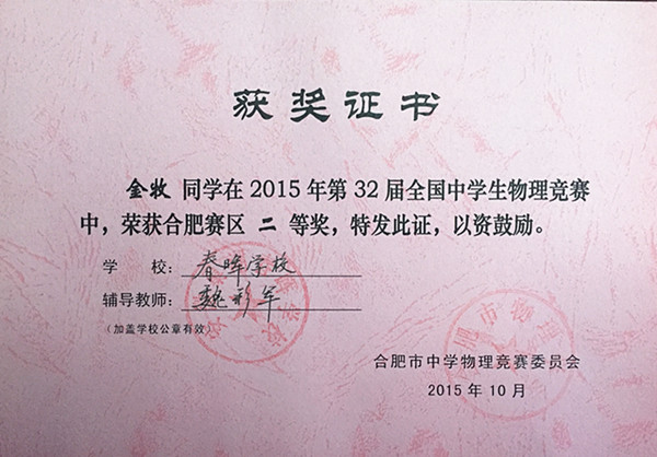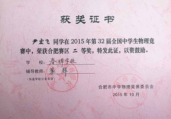 我校学子喜获全国中学生物理竞赛合肥赛区二等奖