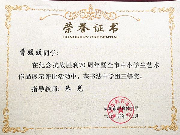 2015年12月,曹媛媛同学在巢湖市教体局举办的纪念抗战胜利70周年暨全市中小学生艺术作品展示评比活动中,获书法中学组三等奖。 |
