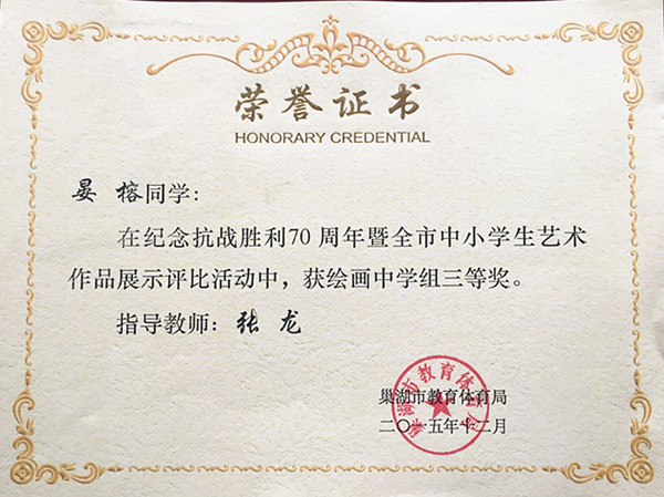2015年12月,晏榕同学在巢湖市教体局举办的纪念抗战胜利70周年暨全市中小学生艺术作品展示评比活动中,获绘画中学组三等奖。 |