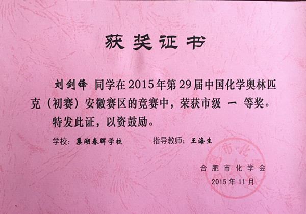 2015年11月,刘剑锋同学在2015年第29届中国化学奥林匹克(初赛)安徽赛区的竞赛中,荣获合肥市级一等奖。 |