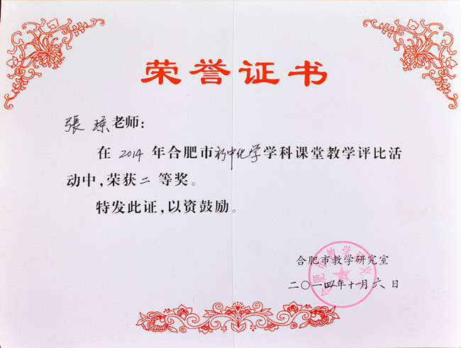热烈祝贺我校张琼老师在合肥市2014年初中化学优质课评选活动中荣获二等奖! 张琼老师在上半年举办的巢湖市2014年初中化学优质课评选活动中荣获一等奖,代表巢湖参加合肥市比赛,获得合肥市二等奖!
