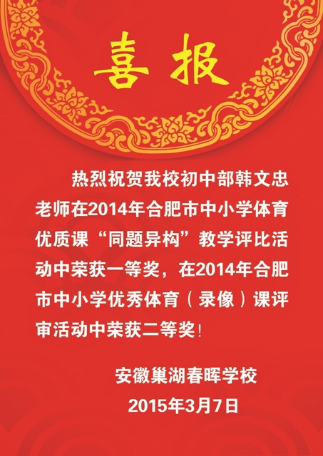 热烈祝贺我校韩文忠老师荣获2014合肥市中小学体育优质课评比一等奖