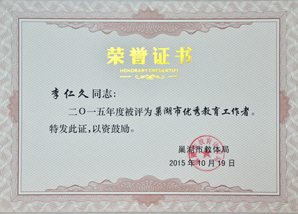 热烈祝贺李仁久被评为巢湖市优秀教育工作者