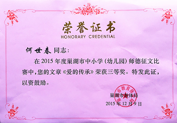 我校何世春老师在2015年度巢湖市中小学师德征文比赛中荣获三等奖