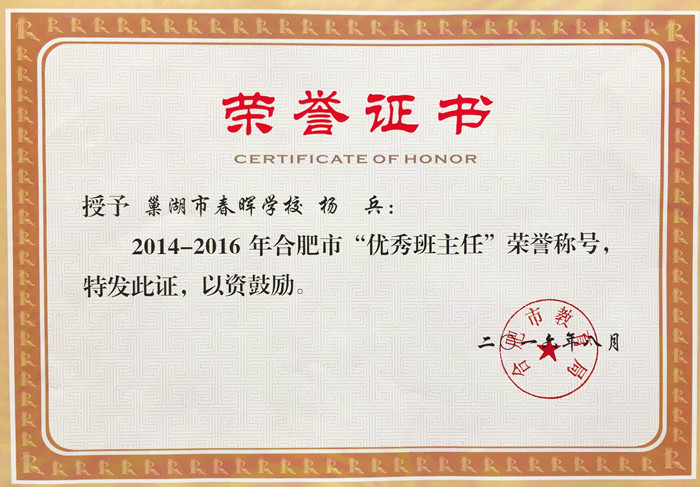 我校杨兵老师荣获合肥市“优秀班主任”荣誉称号