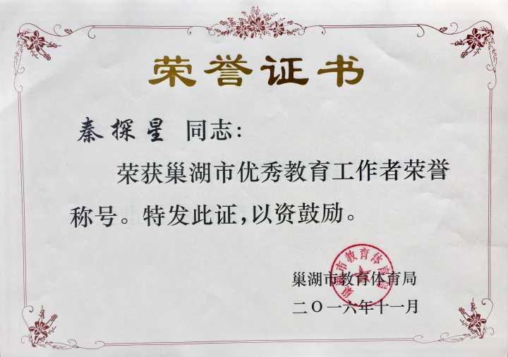 秦探星同志荣获巢湖市优秀教育工作者荣誉称号