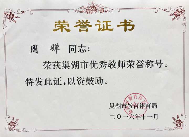周婵老师荣获巢湖市优秀教师荣誉称号