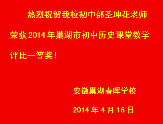 热烈祝贺我校初中部圣坤花老师荣获2014年巢湖市初中历史课堂教学评比一等奖