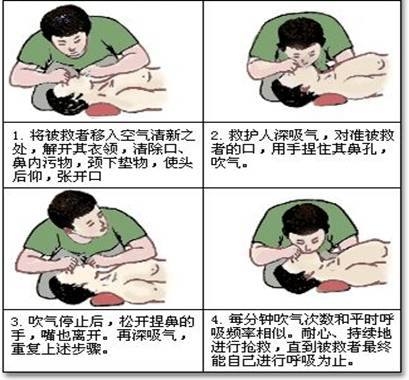 呼吸心跳停止:及时对伤者进行口对口的人工呼吸,进行简单的心脏按摩。