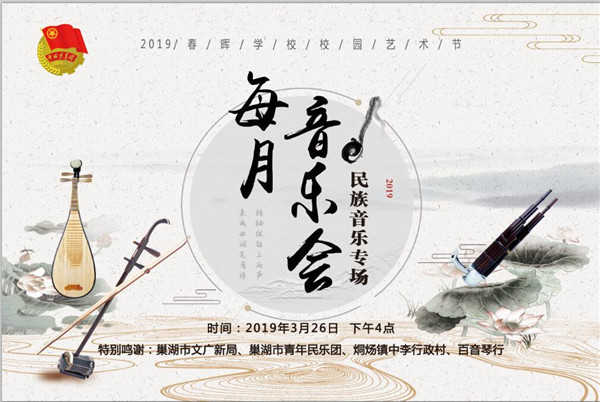 为落实习近平总书记关于坚定文化自信的讲话精神,弘扬优秀传统文化,让传统艺术走进校园,3月26日下午,春晖学校邀请巢湖市众多著名艺术家来校举办了校园艺术节——民族音乐专场音乐会。