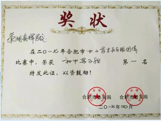 在2017年合肥市中小学乒乓球比赛中,春晖学校荣获初中男子组团体第一名。