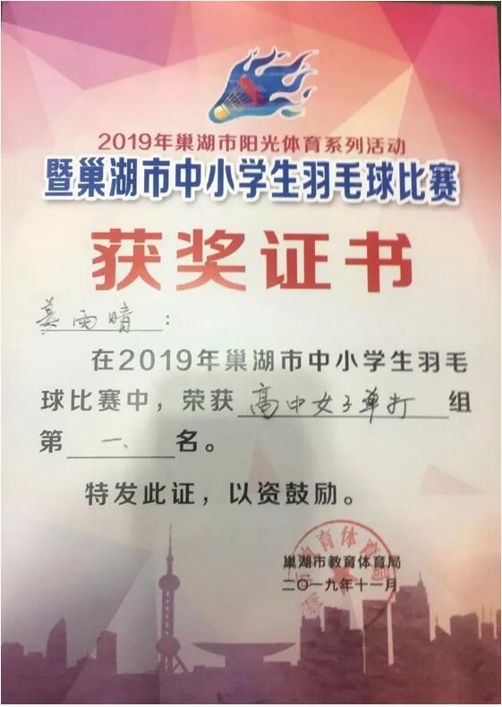 2019年巢湖市中小学生羽毛球比赛中,春晖学子姜雨晴获得了高中女子单打第一名。