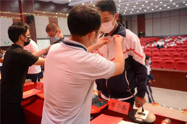 校领导为新团员颁发团员证佩戴团徽