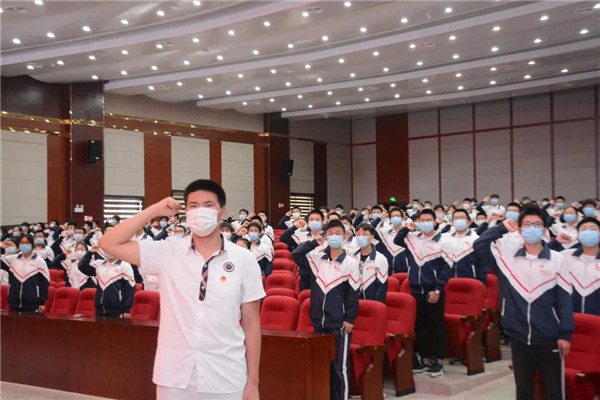 经团支部、年级部推选,校团委副书记夏凡在大会上宣读并批准了197名优秀学子成长为新团员。夏凡书记希望新团员们能够做到一名团员就是一面旗帜,一名团员就是一支队伍。与会行政领导为新入团的同学们佩戴了团徽并颁发团员证。