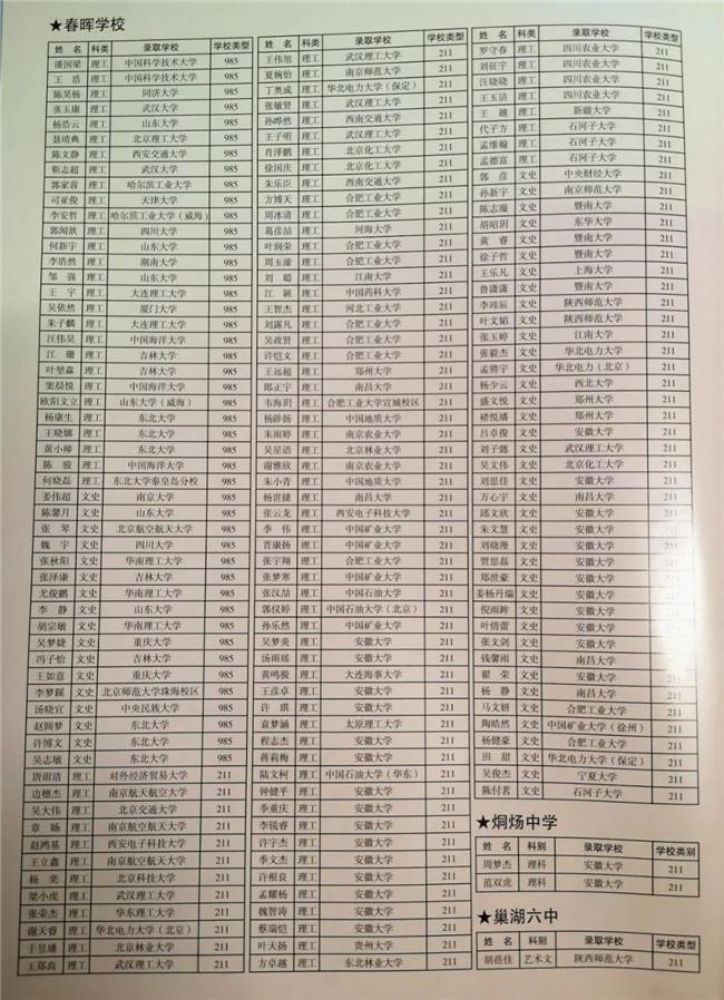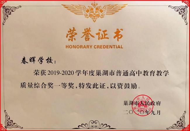 2020年高考成绩 2020年高考,春晖学校姜伟超同学以637分并列巢湖市文科第一名(这也是近五年高考中,春晖学校培养的第4个巢湖市第一名);全校文理科一本总达线率92.66%,本科达线率99.08%。其中理科一本达线率96.29%,本科达线率100%;文科一本率86.90%,本科达线率97.62%。 2020年高考,春晖学校总参考人数435人,600分以上145人,全市最多!被双一流高校录取的人数全市最多(有45人被985高校录取,被211以上高校录取的有161人)!理科竞赛班35人,均分高达639.6分。同时,春晖学子胡考宁被中国空军航空大学录取。 春晖学校2020年高考录取985、211高校名单