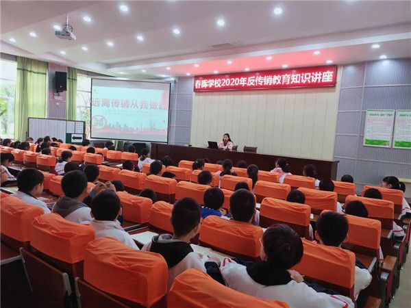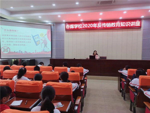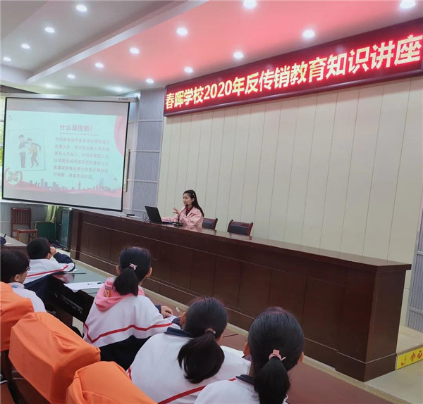 为了守护校园安全,增强广大学生对传销的辨别抵制能力,10月18 日上午,春晖学校七年级举办了“2020年反传销教育知识讲座”。