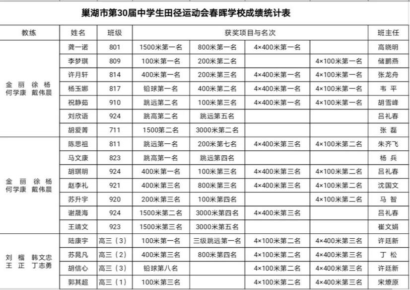 10月24日—26日,在巢湖市第30届中学生田径运动会中,我校运动员不畏强手、敢打敢拼,一举荣获初中女子组第一名、初中男子组第二名和高中男子组第三名的好成绩。今天,让我们来看看他们取得的骄人成绩吧!
