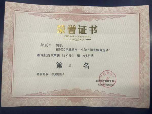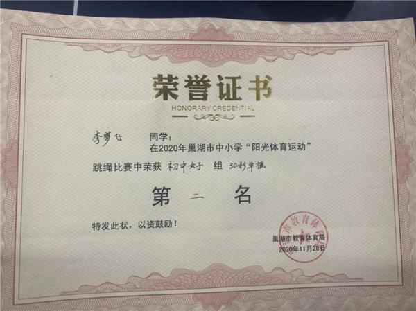在刚刚结束的巢湖市2020年中小学生跳绳比赛当中,我校陈美玲、何学康教练带领的男女四名运动员取得了初中男子30秒竞速第一名第三名,女子双第二名的好成绩。