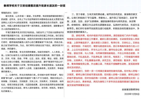 学校德育处印《春晖学校关于文明创建整改提升致家长朋友的一封信》,通过微信公众号向社会提出创城倡议,竭力为巢湖市创建全国文明城市贡献力量。 |