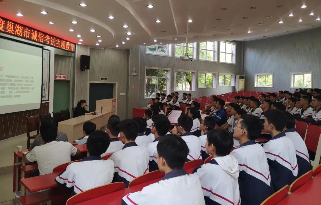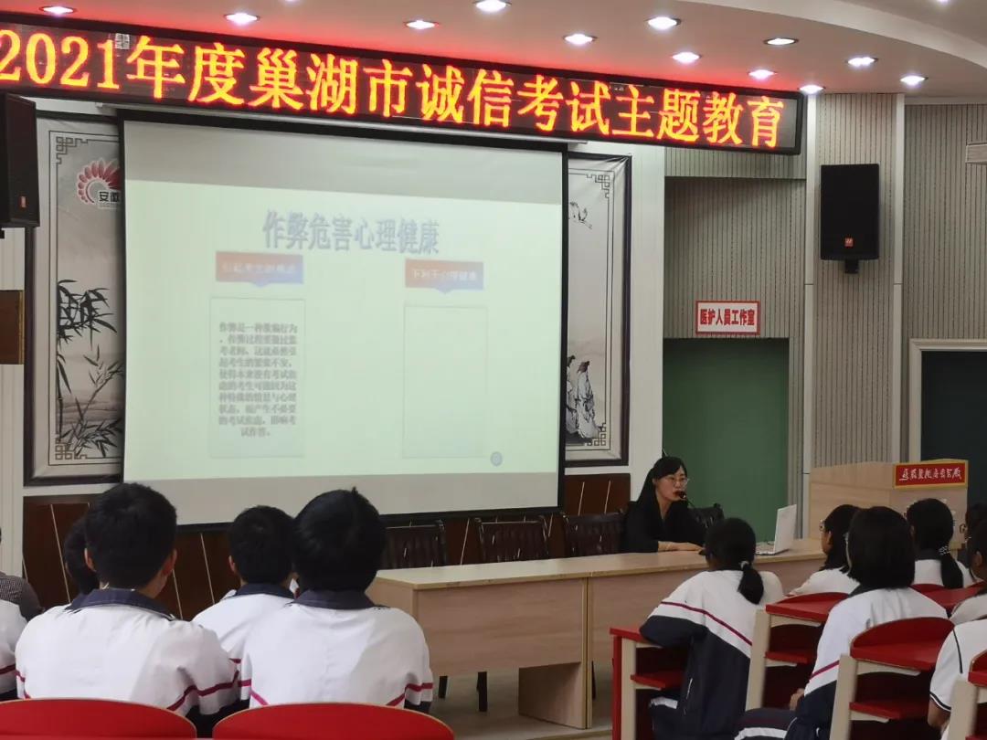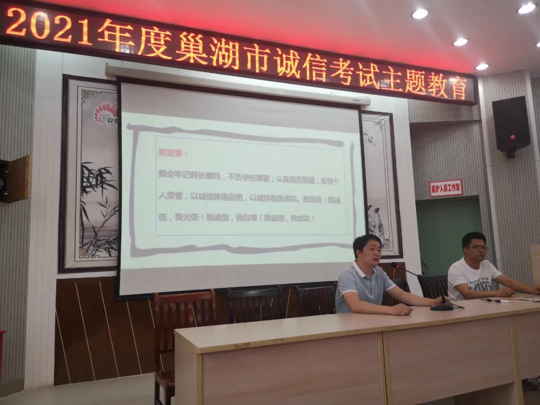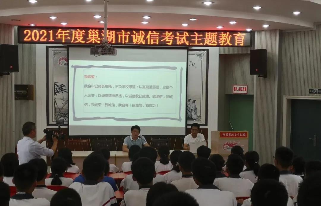 为积极培育和践行社会主义核心价值观,进一步强化考试纪律,加强考风考纪建设,促进公平公正,营造诚信考试的良好氛围,助力我市信用体系建设,5月25日下午,巢湖市教体局在春晖学校团结路校区开展了2021年巢湖市诚信考试主题教育活动。