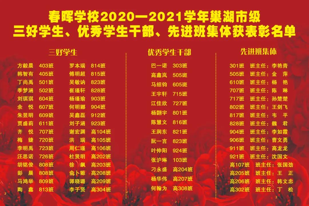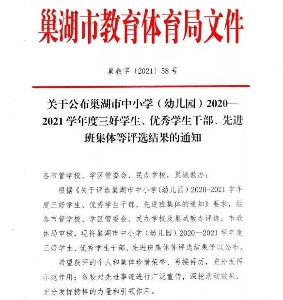 巢湖市中小幼2020—2021学年度 三好学生、优秀学生干部、先进班集体等 评选结果 公布啦