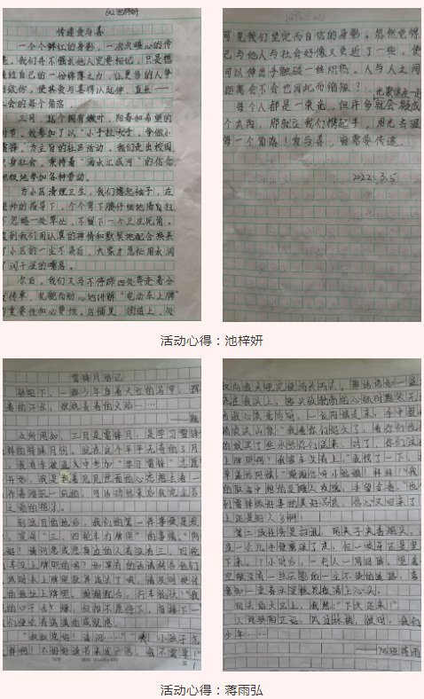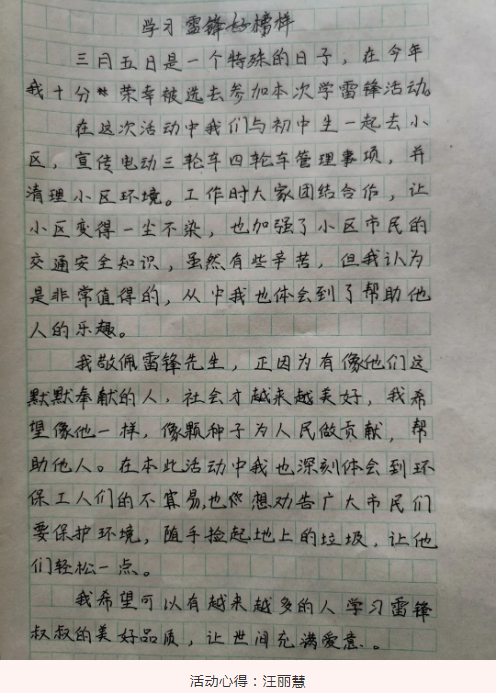 活动中,同学们不仅热情积极、彬彬有礼,耐心地提醒社区居民在3月31日前给三轮四轮车登记上牌,还向沿街商铺宣传保持各自商店门口环境卫生的重要意义。活动结束前,同学们对小区进行了卫生清扫。返校后,同学们还用文字记下了本次学雷锋活动的感受。