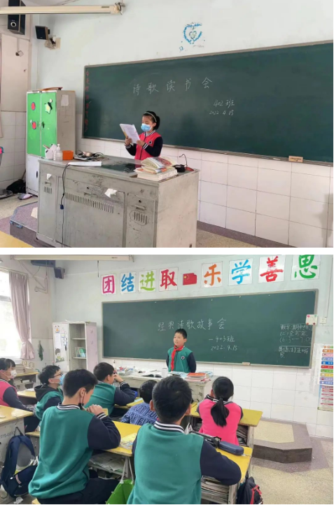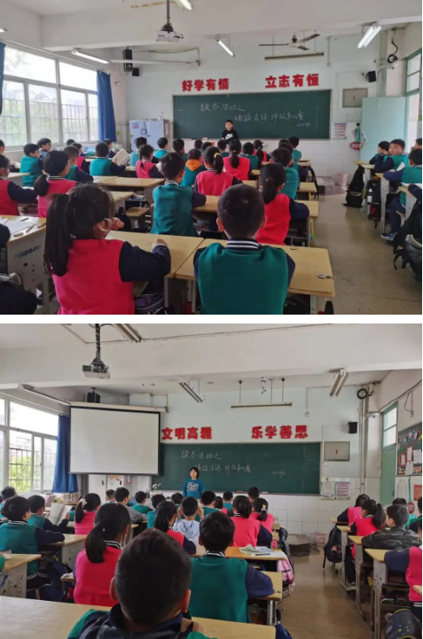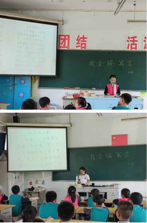 你听,三年级的小小朗读者们个个声情并茂,编写的寓言故事充满童趣。四年级的课堂中,一首首诗歌让人陶醉。