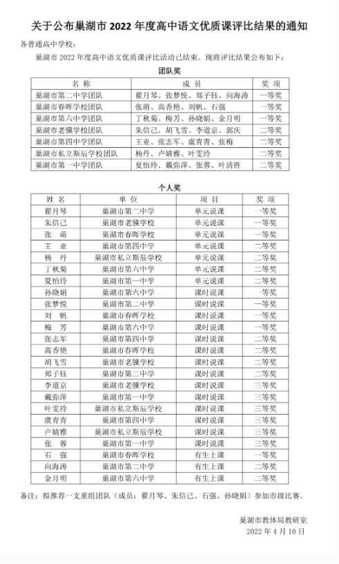 现巢湖市教育局拟推荐一支重组团队(我校石强老师为团队成员之一)参加合肥市级的比赛,相信他们定能取得优异的成绩,预先恭祝他们旗开得胜!