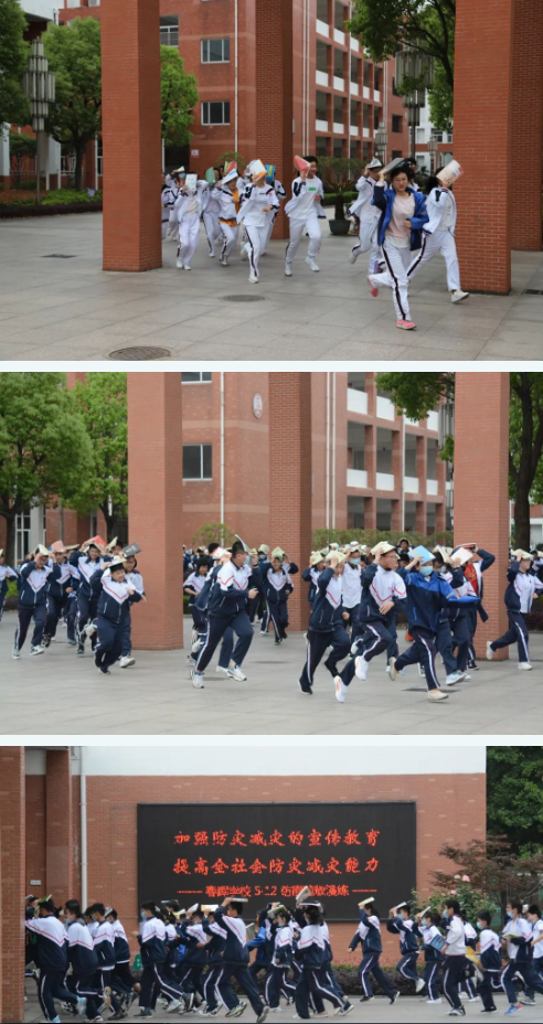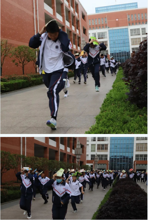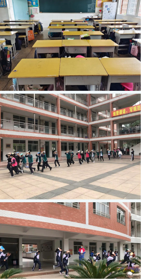 演练前,两校区德育处负责人通过班级广播带领同学们学习了防灾应急逃生知识,并再次强调演练的流程和纪律要求。随着警报声响起,同学们在教室内迅速双手护头,躲到桌子下,进行应急避险。警报信号 12秒后,在老师的引导下,同学们手持课本,护住头部,安全、有序撤离了教学楼。全部到达指定地点仅用时一分多钟,圆满完成本次应急疏散演练。
