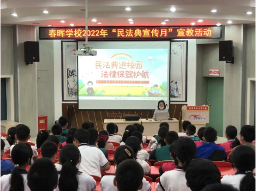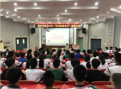 2022年5月份是全国第二个“民法典宣传月”,为深入学习贯彻习近平总书记关于加强《民法典》学习宣传的重要指示精神,让《民法典》走进学校,走到师生身边,走进师生心里,5月18日下午,春晖学校朱晓雅老师在团结路校区多功能厅为同学们开展了主题为“典亮校园 护航成长”的《民法典》宣教活动。