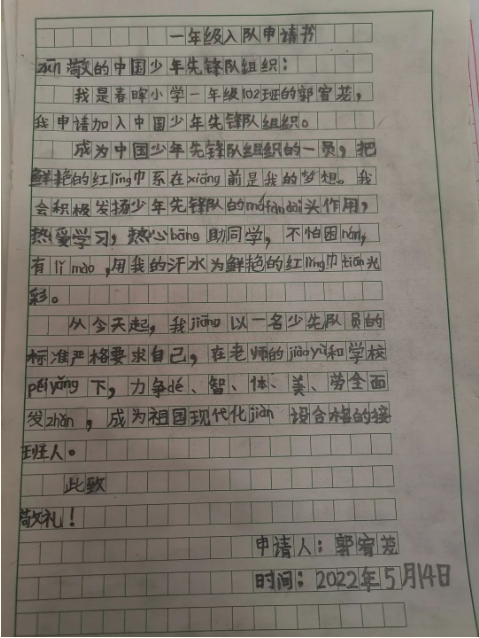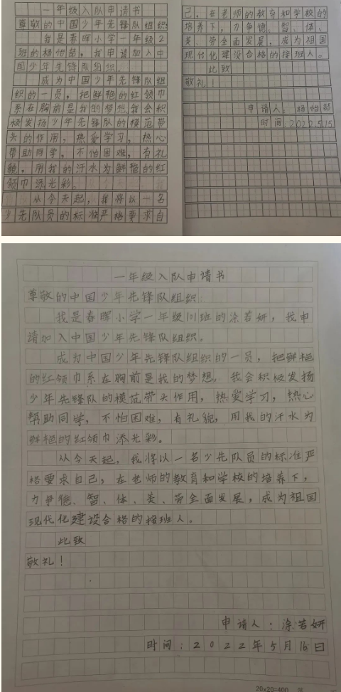 为帮助预备队员了解少先队组织,此前,少先队还开展了视频学习、学唱队歌、写入队申请书等活动,进一步加深了同学们对少先队组织的了解和向往。
