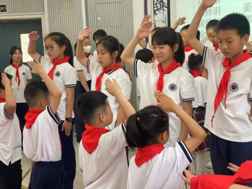 在大队辅导员李琴老师的带领下,新队员们面向队旗进行了庄严宣誓。