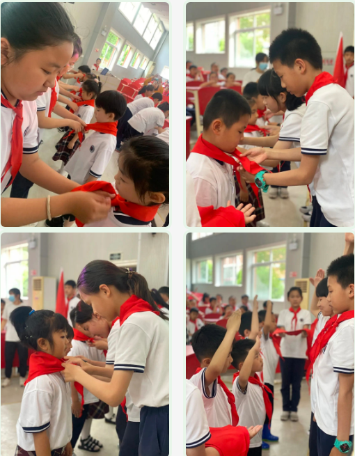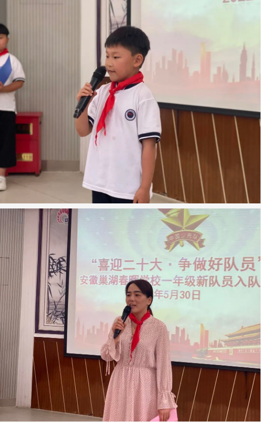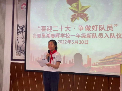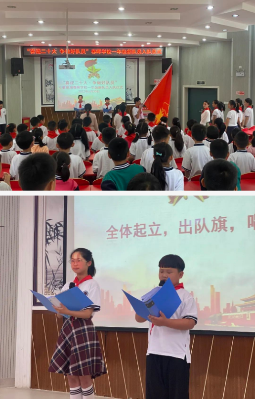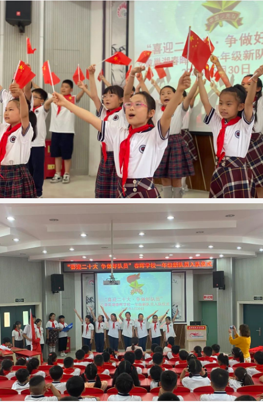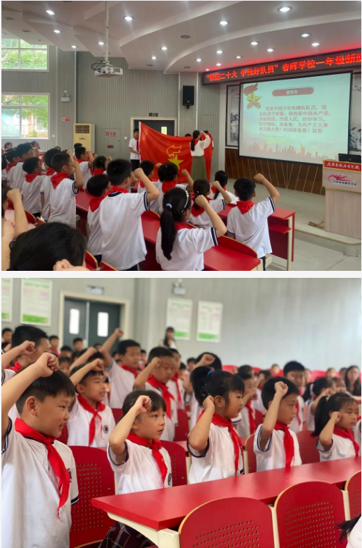 5月30日,在欢快的《红领巾飘起来》旋律声中,春晖学校“喜迎二十大 争做好队员”一年级新队员入队仪式在多功能厅举行。
