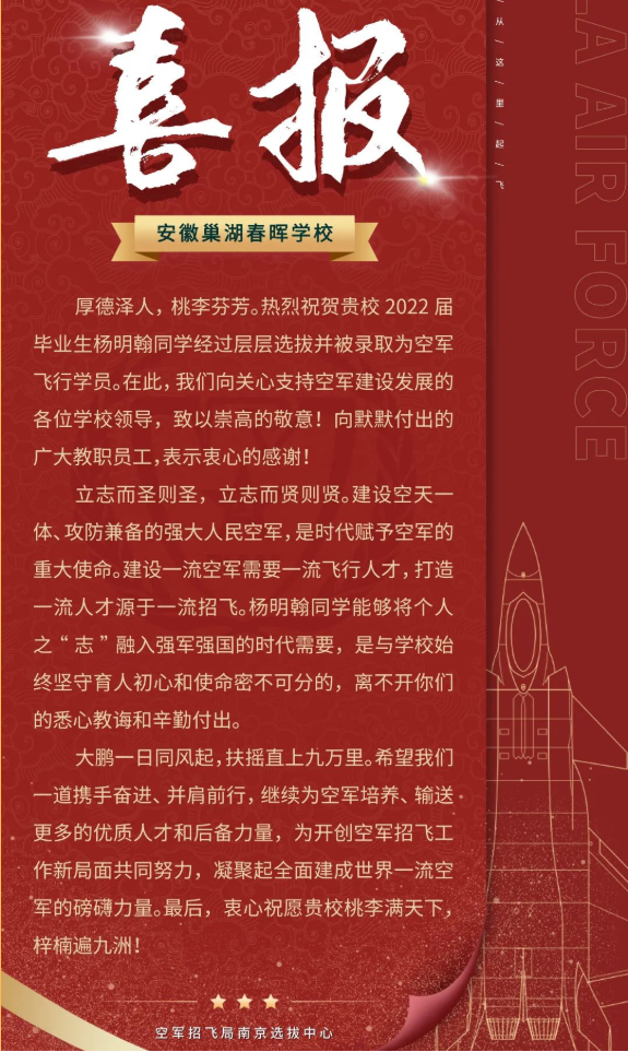 日前,中国人民解放军空军招飞局南京选拔中心向春晖学校发来贺信,祝贺春晖学校杨明翰同学经过层层选拔,被录取为空军飞行学员;向所有关心、支持空军建设发展的教职员工表示衷心感谢