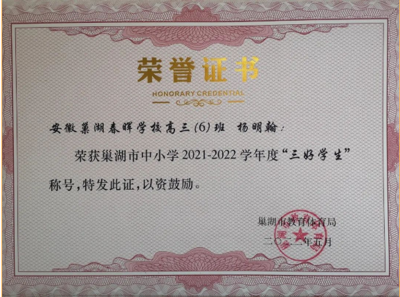 杨明翰同学系春晖学校2022届高三(6)班学生。初、高中的六年学习生活均在春晖学校度过。在校期间,杨明翰同学始终以积极向上的态度刻苦学习,高一高二年级连续被评为校级“三好学生”,高三年级时更以优异的成绩和良好的道德品质获评巢湖市“三好学生”,并在高三年级顺利加入中国共产主义青年团。