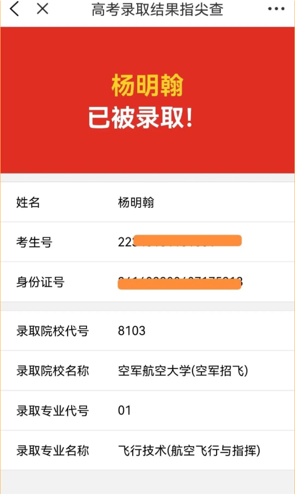 杨明翰从小就对军队和蓝天有着浓厚的兴趣,希望有朝一日能够驾驶雄鹰翱翔祖国蓝天。因此,在空军招飞局来校招生时,杨明翰积极报名参加。经过初审、文化测试、身体检查、心理评估、政治审核等层层选拔,杨明翰同学凭借优异的高考文化成绩和优良的身体、心理、政治素养,最终脱颖而出,顺利被空军招飞局录取为空军飞行学员。