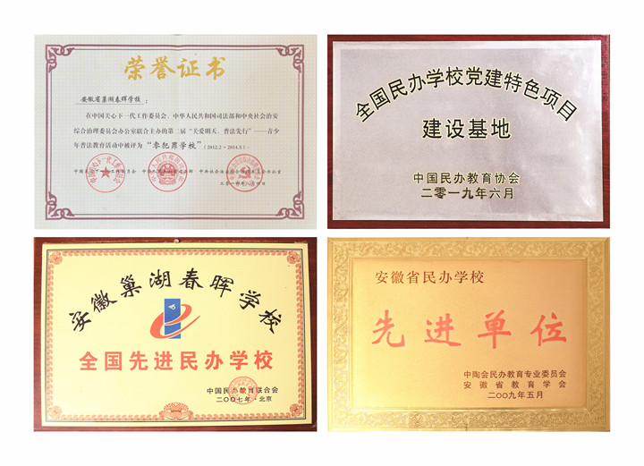 办学14年来,春晖学校在各个方面均取得了诸多荣誉:被中国民办教育协会授予“全国民办学校党建特色项目建设基地”,校党委被中共安徽省委组织部和安徽省委非公经济和社会组织工委联合命名为第二批省级“双比双争”先进社会组织党组织。同时先后被评为全国“零犯罪学校”、全国先进民办学校、安徽省民办学校先进单位、安徽省语言文字规范化示范学校、合肥市第十二届文明单位、合肥市卫生先进单位、合肥市“体育后备人才基地”、“合肥市餐饮服务食品安全监督量化优秀等级单位(A级)”等,受聘为“中国西部教育顾问单位”。学校连续多年获得巢湖市初中教育教学质量综合奖一等奖。